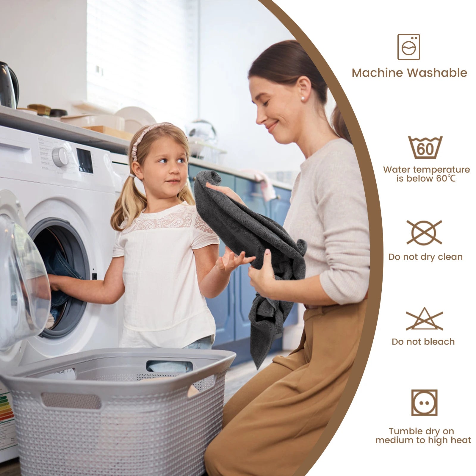 Machine wash: per 3-4 days with warm water ,haking the towel when taking out of the washer,it will be fluffing up the terry loops,enhancing absorption.