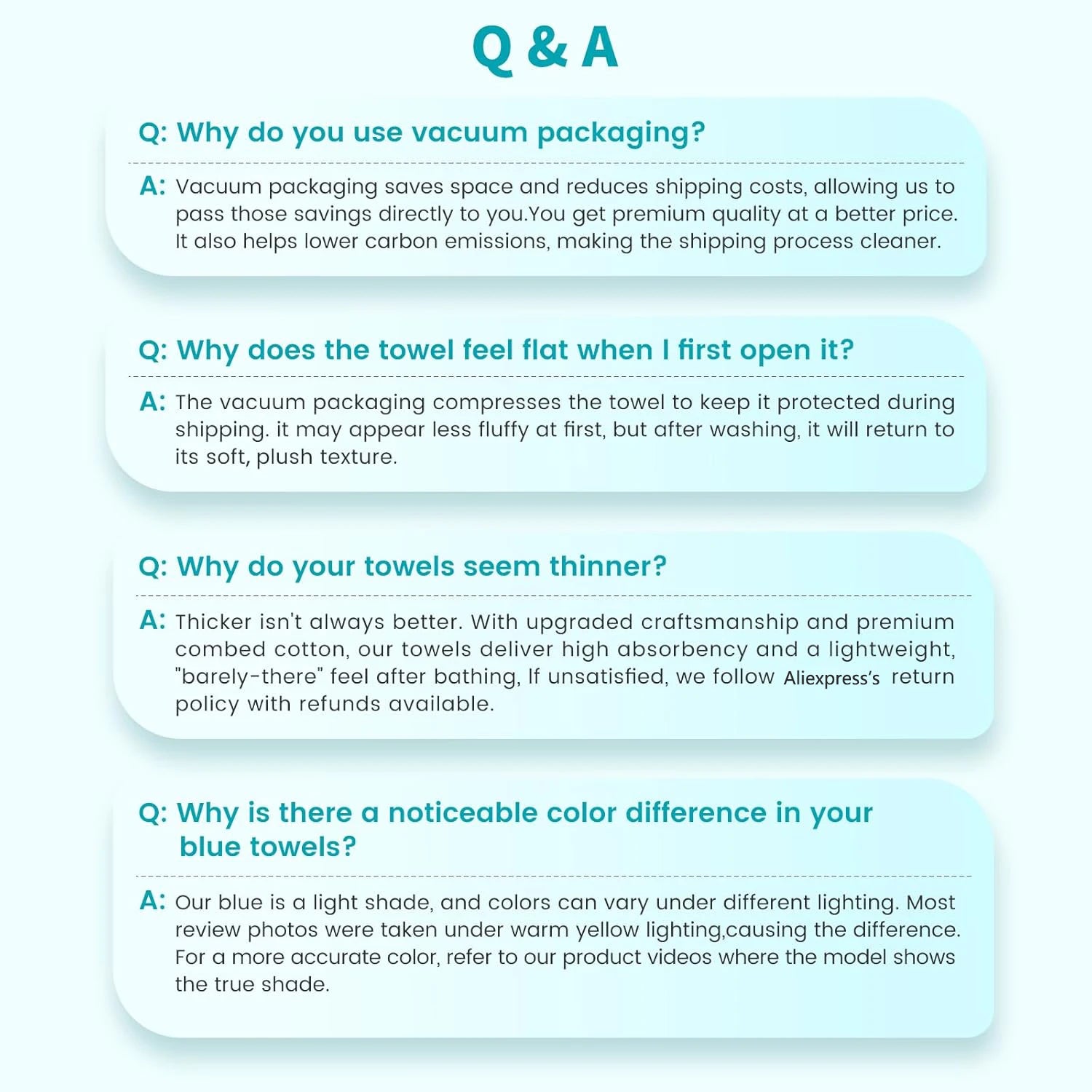 Washing: Towels should be washed separately or mixed other white items, avoided subtle discoloration over time.