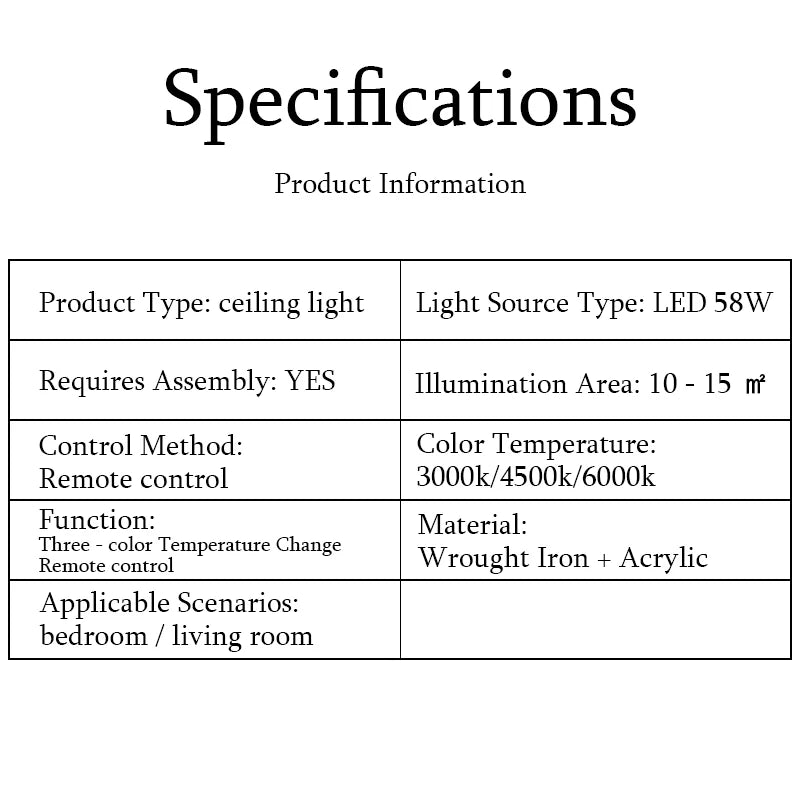 58W LED source, energy-saving & bright, fit for 10 - 15㎡ (bedrooms, studies). Remote controls color temperature (white/neutral/warm) and brightness for various scenarios.