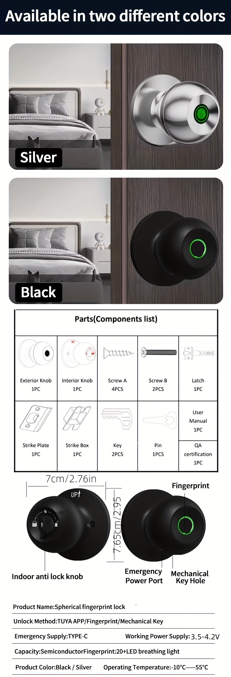 Manenvari Tuya Smart Door Lock BT Wireless Aluminum Alloy 36V Rechargeable Lithium Battery Fingerprint USB Charging Remote Control, Easy Installation Can Smart Home Compatible With Tuya Smart Lift APP For Room, Garage, Office