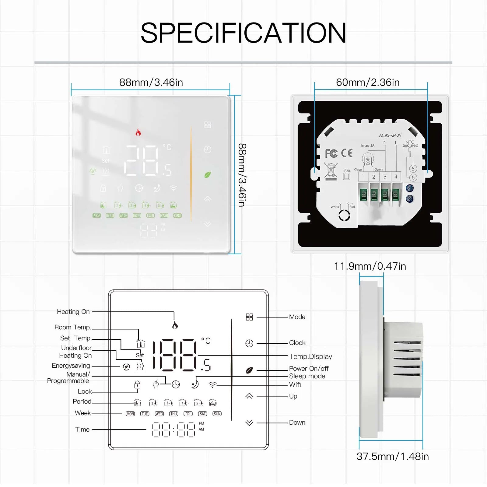 Amazing new soft touch design with lens edge 2.5D arc effect and colorful LED screen display,looks like a beautiful scenery and hidden touch button simplifies the UI to a large extent.The ultra-thin embedded panel perfectly fits all kinds of walls,with standard 86mm square cassettes and 60mm European cassettes to meet all installation environments;±1℃ accuracy keeps temperature within the level you set.